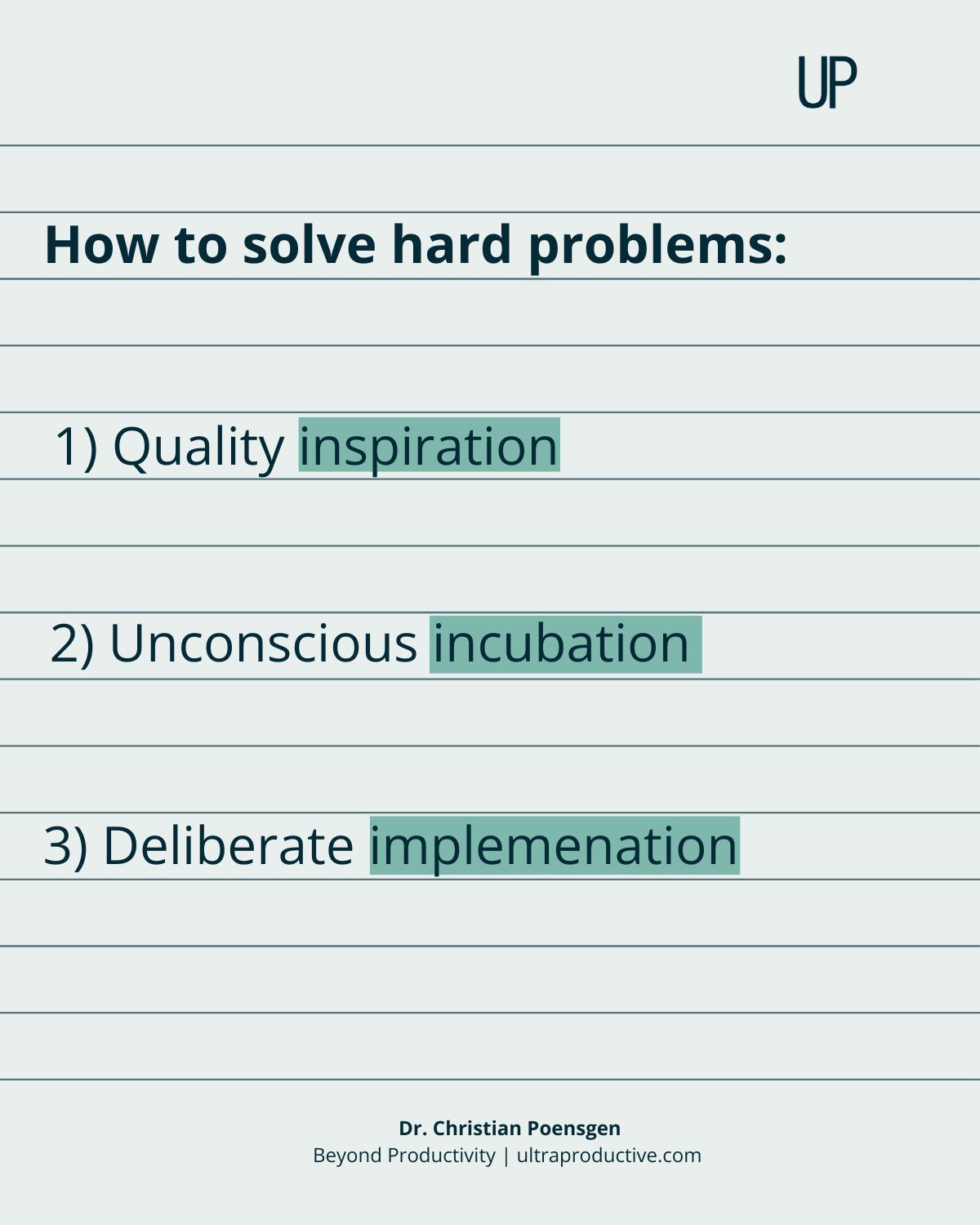 Creative implementation requires what Cal Newport calls Deep Work (again, that book is a must-read). Our “Ultrafocus” method is a simple way to make this work on a busy schedule. Make it a priority to focus intensely on that task for 60-90 minutes at a time each day. Use our 30-3-11 rule to time it when your energy and motivation are highest: ~30 minutes after waking, ~3 hours after waking, or ~11 hours after waking. For 75% of us, mornings are best. If you want to learn more about the Ultrafocus method, read this article.